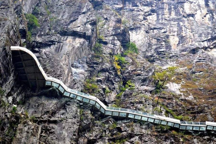 是大理蒼山之門,座落在蒼山西坡馬龍峰和玉局峰之間,是一個巨型V字的天然大峽谷。石門關高空玻璃棧道比著名的張家界玻璃棧道還要長20公尺,棧道全長1550公尺,距離地面的最高垂直高度為170公尺,其中80公尺玻璃棧道,是目前中國西南地區唯一的空中棧道,滿足旅遊者探險,求奇,求新的需求。棧道的一側還有一個凸出棧道外7米的玻璃觀景平臺,可供遊客俯瞰危崖,碧水深潭。棧道上使用的玻璃,來自與張家界玻璃棧道同一個廠家生產的特製玻璃,每平方米的承重能力高達6噸。