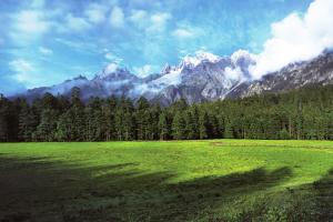 在雲杉坪一大片寬闊美麗草坪,遠眺海拔5596公尺的玉龍雪山,是中國最南的雪山,雪山山腰雲騰霧繞,遠望像一條銀白色的巨龍,因此得名。為納西族的神山和聚居地之一;納西族人稱雪山爲「波石歐魯」,意爲白沙的銀色山岩。