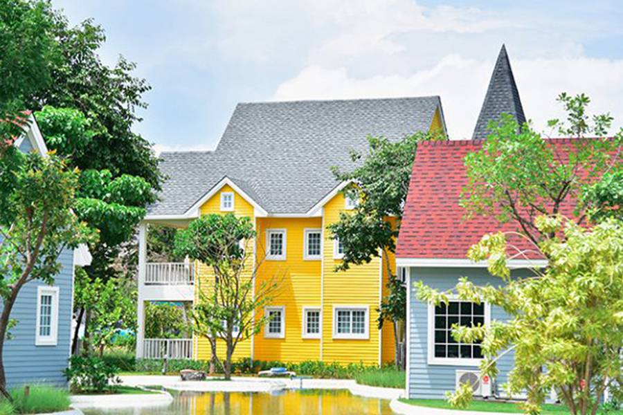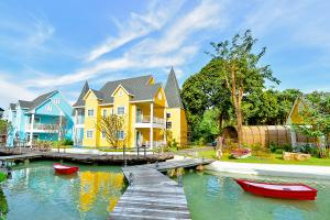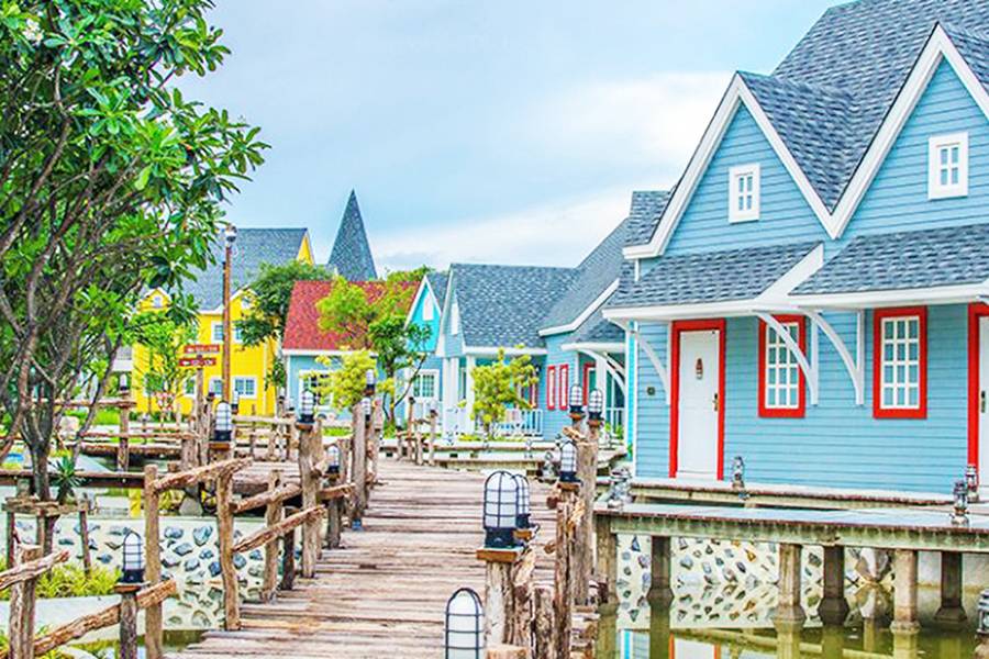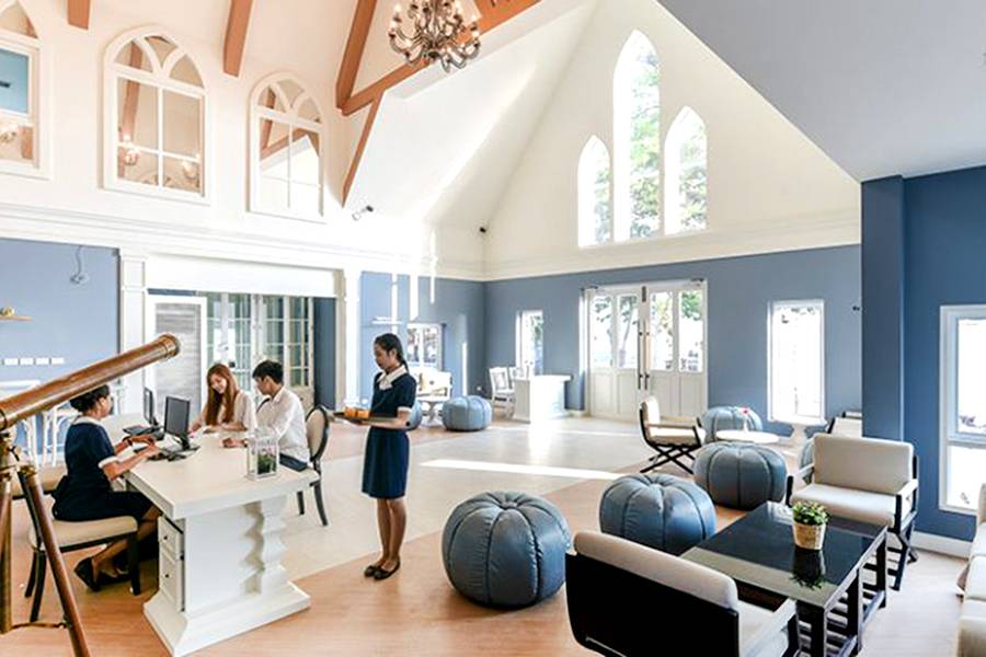 公主灣歐式莊園坐落在寧靜Chao Lao Beach海灘幾步之遙,風景如畫的白砂海灣以及崎嶇的岩岸,色彩繽紛的小房子及仿燈塔,原型是歐陸風如詩如畫的Peggy Cove海灣漁村,流淌在整個前台的木橋拱起和Peggy灣的流淌的小溪,由加拿大籍名設計師所設計,柔和藍色調的飯店大廳讓人一入門就覺得舒適。